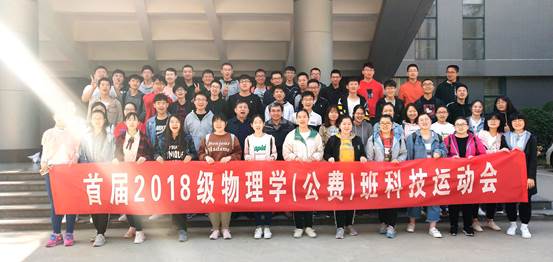 在五四青年节来临之际,420日上午,以科技就是力量为主题的首届2018级物理学公费师范生科技运动会在实验中心举行。NBA直播8 党委副书记孙金杰、副院长王海龙和公费师范生班主任李建彬出席了运动会开幕式,开幕式由辅导员助理王宝华同学主持。
