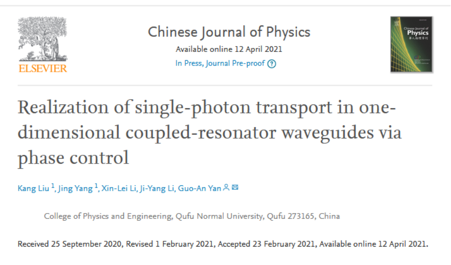 2018级物理学专业刘康、杨晶、李新蕾、李霁洋的研究论文(Kang Liu#, Jing Yang#, Xin-Lei Li, Ji-Yang Li, Guo-An Yan*, Realization of single-photon transport in one-dimensional coupled-resonator waveguides via phase control,Chinese Journal of Physics(2021), DOI: //doi.org/10.1016/j.cjph.2021.02.016)。该论文以NBA直播8在线直播