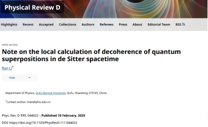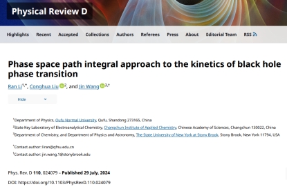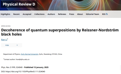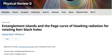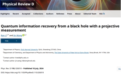 李然副教授在广义相对论和黑洞理论方向取得一系列研究进展,相关成果发表于《Physical Review D》和《European Physical Journal C》等国际学术期刊,包括PRD论文5篇和EPJC论文1篇,并指导本科生王力强同学在PRD发表论文1篇。上述研究成果均以曲阜师范大学为第一署名单位,并得到了纽约州立大学石溪分校汪劲教授的悉心指导与大力支持。