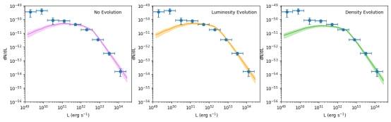 不同演化模型下长伽玛暴光度分布(蓝色数据点)与塌缩暴光度分布(实线)的比较。在低光度,无论哪种模型,长伽玛暴都明显高于塌缩暴的光度分布。