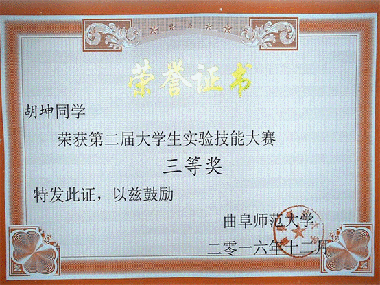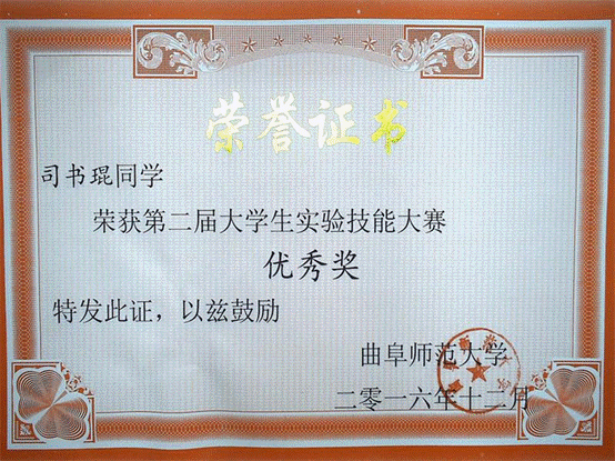 曲阜师范大学第二届大学生实验技能大赛证书