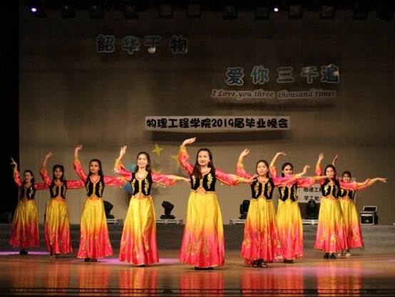晚会开场视频截取了毕业生们四年生活的片段,回忆起难忘的校园生活,离别之绪和感恩之情相互交织,深深地触动了现场观众的心弦。一段活力十足的开场舞《Keep Dancing》迅速点燃了现场气氛;歌曲串烧《你被写在我的歌声里》唤起了同学们对大学生活的回忆和怀念;小品《“钱”因后果》提醒同学们珍惜眼前的宝贵时光;维吾尔族女生极具民族特色的舞蹈引发现场欢呼不断;歌曲《老男孩》、《异乡人》、《岁月神偷》表达了毕业生们对离别的不舍和对未来的期待;模特协会带来的走秀点燃全场气氛,台下掌声经久不息;相声《大话师哥》妙趣横生,逗乐的语言中表达了对师哥师姐的敬意与感谢。值得一提的是小品《贾总的演讲》回忆大学生活的点点滴滴,伴随着一张张毕业生的照片,使毕业生们走入了自己四年的大学时光。最终,晚会在歌曲《活着》中落下帷幕,表达了毕业生们对未来的展望与奋斗的决心。