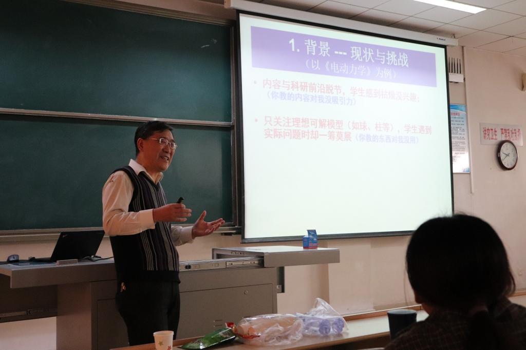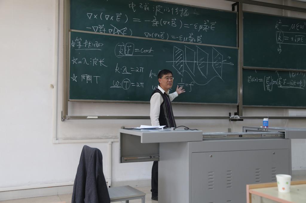 18日上午,周磊教授为学院师生做了题为我们该如何面对不同需求的学生的教学报告,介绍了他在复旦大学讲授《电动力学》课程的经验和体会。18日下午,周磊教授为学院师生讲授了《电动力学》课程第四章电磁波的传播中的第一节平面电磁波。