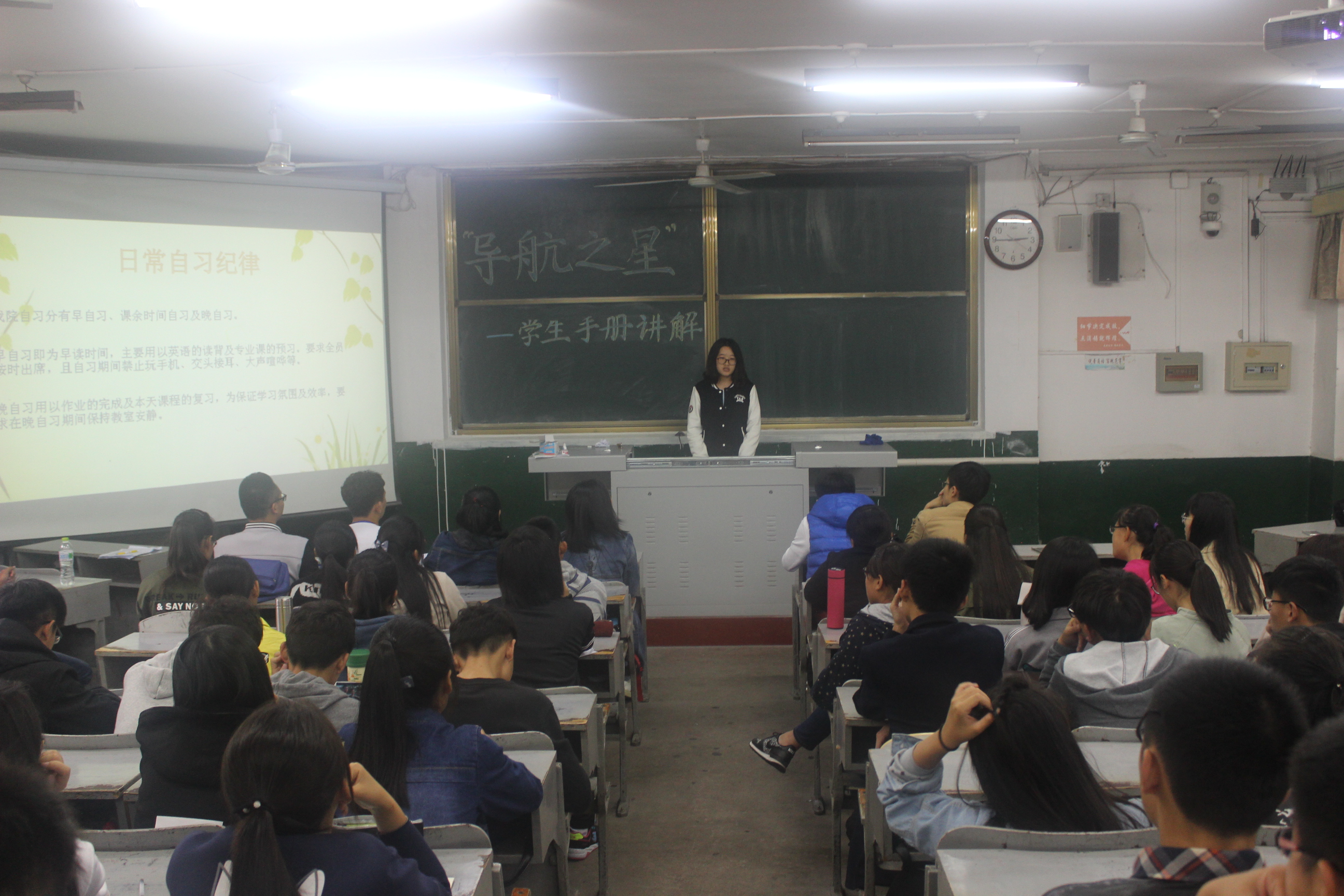 学生会纪检部、宿管部、卫生部、勤工助学部、秘书处共同承办的“导航之星”学生手册讲解活动在院楼二阶一教室、二阶二教室同时举办。2016级全体同学参与本次活动。