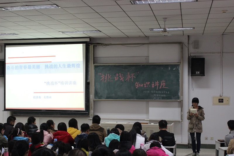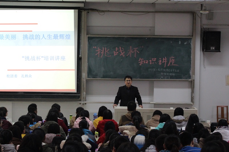 首先,孔书记向大家阐述了“挑战杯”的比赛宗旨及目的,鼓励大家积极参加,并介绍了我校学生历年来的获奖情况。接着,孔书记讲解了“挑战杯”的参赛资格与作品申报方面的事宜,各类挑战赛的主题赛事及奖项设置。随后,孔书记介绍了参加“挑战杯”所要注意的问题及技巧,并特别强调应从自身兴趣出发才能真正发挥比赛的作用。最后,校科技创新部部长纪仁泽讲解了我校学生参加“挑战杯”的具体事宜。