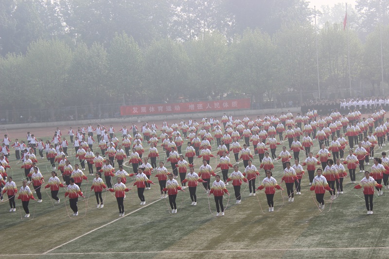 跳绳团体操拉开了团体表演的序幕,整齐一致,节奏欢快,展示了青春飞扬、谁与争锋的精神,带动了全场气氛,也为接下来的运动竞技奏响了有力的开场音。