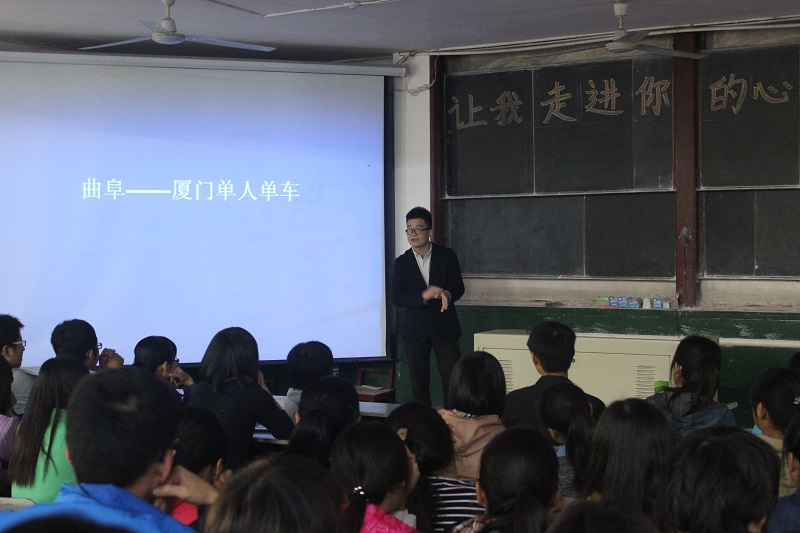 2011级学生赵聪聪向同学们分享了他“曲阜-厦门单人单车行”的难忘经历以及他的感悟,并向同学们推荐了一些有益的书籍。
