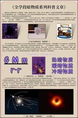 该作品根据不同学段学生的心理特点和知识基础创作了三篇科普文章《宇宙中的隐形者“暗物质”(小初版)》《〈星际采访〉之“暗物质”(高中版)》和《“暗?物质”“暗物质?”(大学版)》,并制作了相关的海报、PPT和汇报视频等。