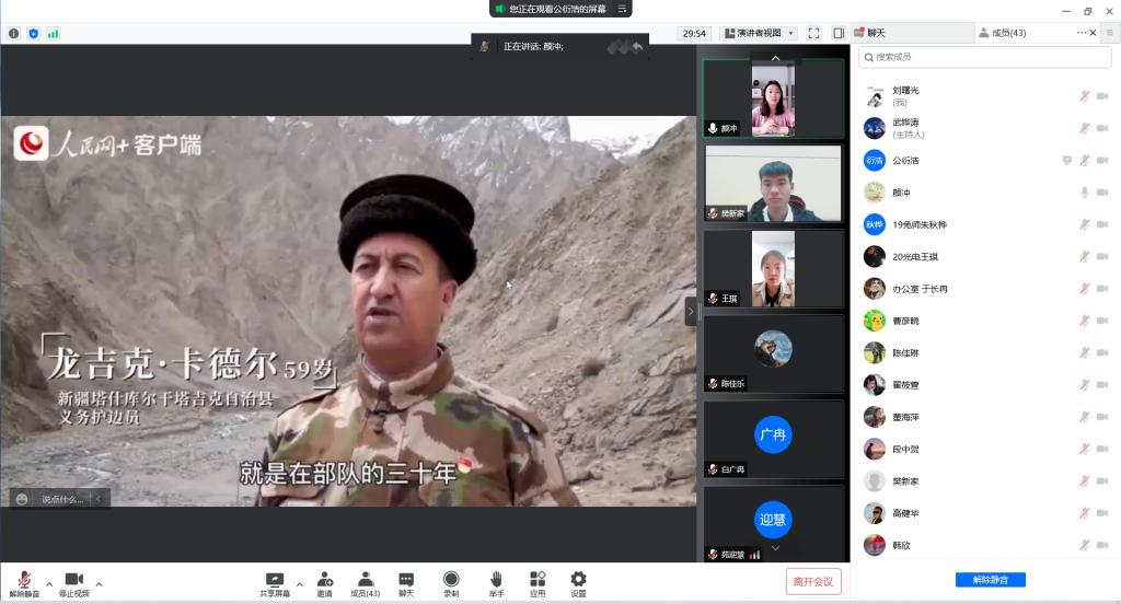 5月8日下午,“同上一堂‘平凡英雄·青春百年’思政大课”线上开讲,学院组织青马工程培训班学员利用腾讯会议线上集中学习,学院团委副书记颜冲主持学习。
