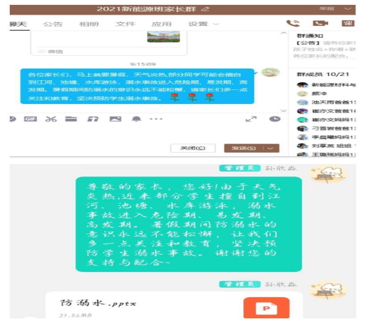 学院在加强学生在校期间安全管理的同时,各年级辅导员通过微信群与学生家长加强联系,切实增强家长的安全防范意识,家校共育做好防溺水安全教育工作,筑牢“预防溺水”的安全防线,保证学生生命安全。