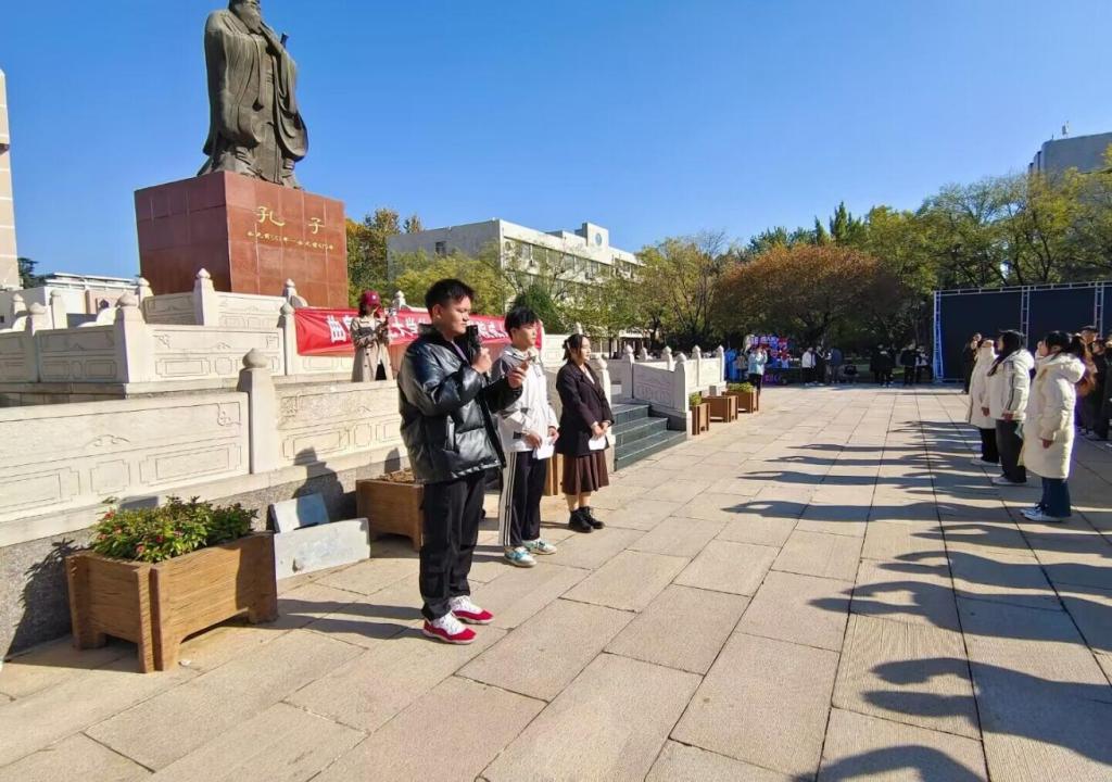 伴随着悠扬的古乐声,参礼同学立于孔子像前,面谒至圣先师孔子,行三揖礼。颜冲和各班班助为学生代表赠书,对同学们寄予期望与嘱托,同学们回以鞠躬礼感谢师长,展现了学院尊师重道的良好风尚。学生代表臧昊带领参礼同学宣誓,用铿锵誓言展现昂扬向上的精神风貌和筑梦未来的信心。学生代表宋蕾呼吁同学们在实践中淬炼自我,以青春之我、奋斗之我,为党和国家事业发展贡献青春力量,展现青春担当。