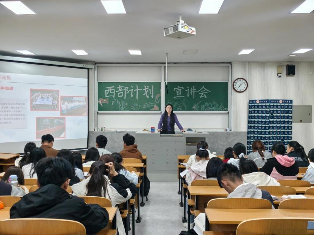 宣讲会上,朱佳文首先通过详细数据分析了2025届毕业生的就业形势。从招募条件、服务领域、生活保障以及未来职业发展路径等方面对2025年志愿服务西部计划政策进行全面解读。借助往届志愿者的服务实例,对同学们较为关注的服务期间的生活补贴、考研加分、公务员定向招录等保障措施进行讲解。针对当前就业形势,鼓励毕业生响应号召,投身西部建设、报效祖国。