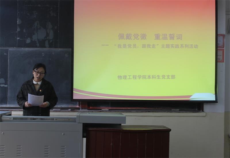 学生党支部举办的佩戴党徽,重温誓词——“我是党员,跟我走”主题实践系列活动在院楼213教室顺利举行,学院党委副书记孙金杰、团委书记王琼、辅导员李爱国、厉成远出席会议,学生党支部全体党员和发展对象参加会议,会议由团委书记王琼主持。