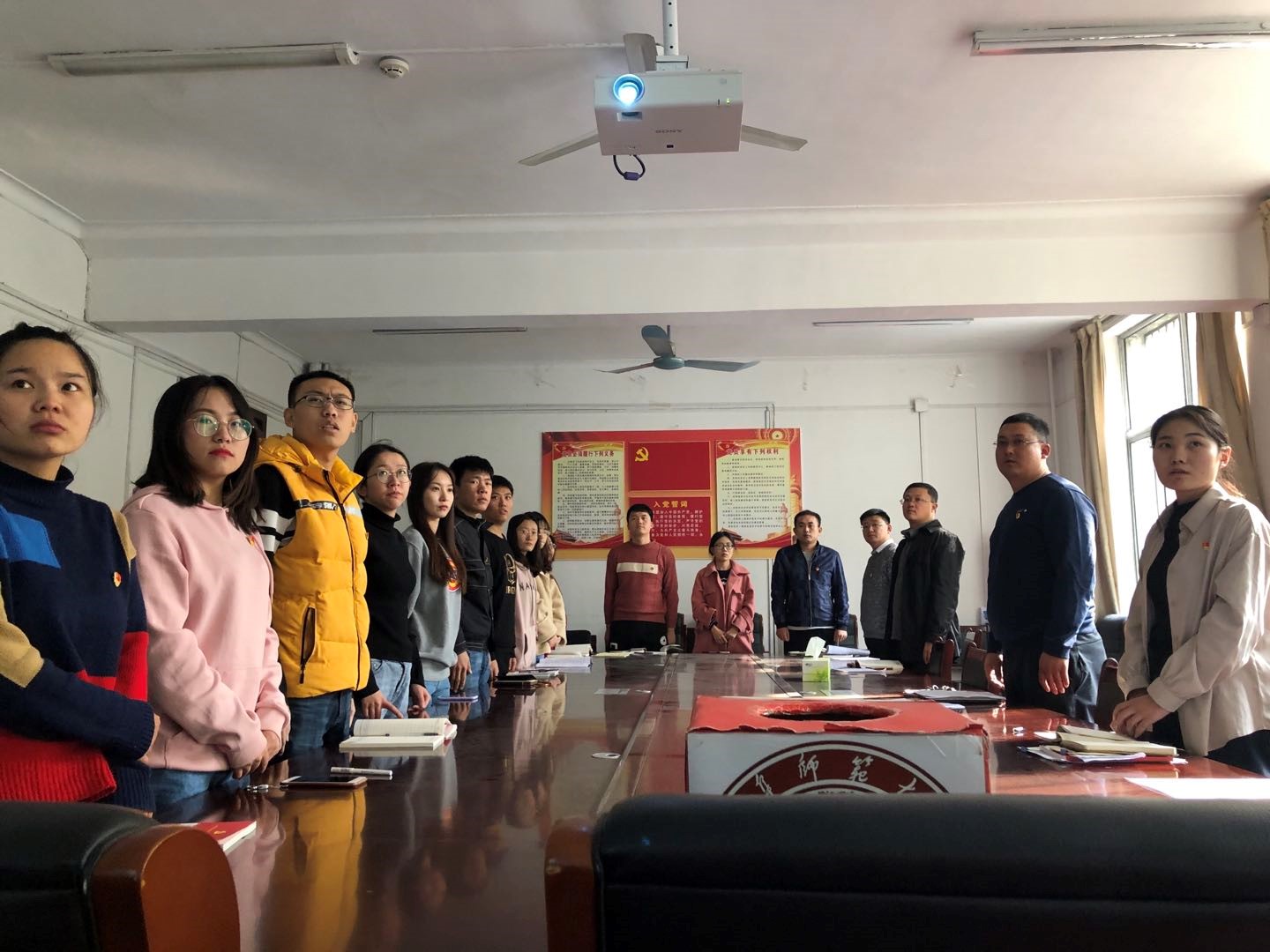 会议伊始,全体党员齐唱国歌。随后,入党申请人认真宣读了《入党志愿书》,阐述个人的入党动机,并向党组织汇报个人表现。接着,入党培养人介绍培养期个人表现情况,然后由支委会宣读申请人的综合政审情况。与会的党员对发展对象能否入党进行充分讨论,并发表个人意见。最后,经研究生党支部与会正式党员投票表决,一致同意接收田聪同志和贾召赛同志为中国共产党预备党员。
