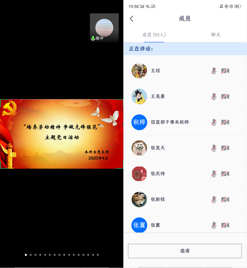 本科生党支部利用腾讯会议网络平台开展“培养劳动精神 争做先锋模范”主题党日活动。本科生党支部书记王琼,辅导员李爱国、颜冲、李靖靖出席会议,本科生党支部全体成员参加。会议由颜冲同志主持。