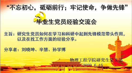 研究生党支部利用腾讯会议开展了“不忘初心,砥砺前行;牢记使命,争做先锋”的线上主题党日活动,毕业生党员在线进行经验交流,研究生党支部全体党员参加,活动由支部书记孙海瑞同志主持。