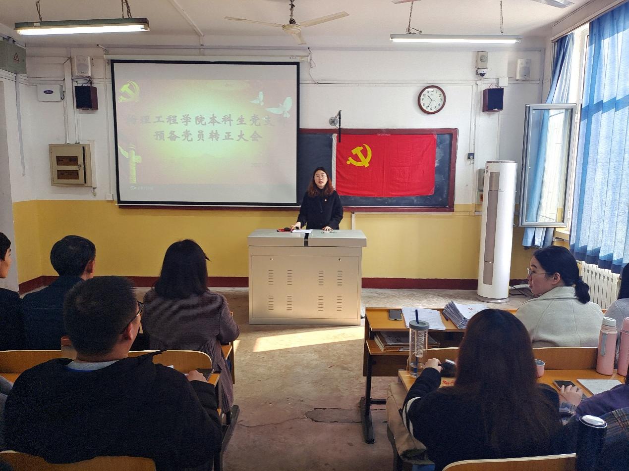 11月19日上午,学院本科生党支部于物理楼407教室召开预备党员转正大会,学院党委副书记王琼,本科生党支部书记颜冲,辅导员李爱国、邱金芝、孔瑞、朱佳文、张杰出席会议,本科生党支部全体党员参加会议。本次大会由颜冲主持。