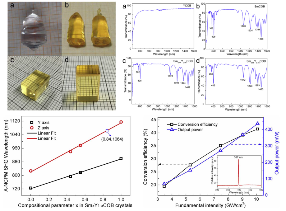 研究团队在SmxY1-xCOB系列晶体倍频性能研究过程中,通过理论计算晶体倍频性质时发现该系列晶体Y轴一类和二类非临界倍频波长范围分别为723-903 nm和1023-1390 nm,Z轴一类非临界倍频波长范围为827-1123 nm,可调谐范围非常宽泛。因此团队采用提拉法生长了SmxY1-xCOB系列晶体,并对其光学性质进行系统表征。采用794 nm的飞秒光源进行倍频实验,Sm0.44Y0.55COB晶体实现了397 nm蓝光高效输出。相关成果发表在Journal of Alloys and Compounds, 762(2018)431-437上,刘彦庆博士为第一作者,NBA直播8在线直播