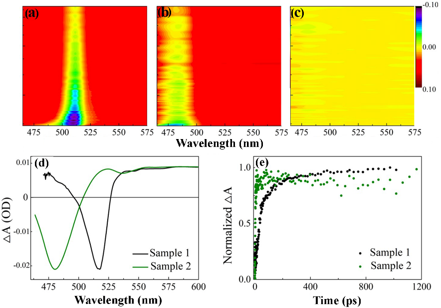 量子点(QD)是典型的低维物理体系,具有显著的尺寸依赖量子限域效应。钙钛矿量子点在光致发光量子产率(PLQY)和颜色纯度方面具有显著优势,以量子点照明和显示为代表的光电子器件(如QLED和QDTV)应用前景巨大。硕士研究生徐帆通过控制生长温度,获得了具有尺寸和带隙可调的CsPbBr3发光量子点,利用稳态荧光和飞秒瞬态超快光谱清晰展示了CsPbBr3量子点的量子尺寸效应热声子瓶颈效应,并详细讨论了热载流子的冷却动力学过程,相关结果发表在J Alloy. Compd. (DOI: 10.1016/j.jallcom.2020.154834, 2020)。博士生孔晓波通过改变合成程中添加配体 (AMPS)的浓度,也实现了钙钛矿量子点大小控制。但随着配体电负性的增加,观察到了与传统量子尺寸限制效应相反的PL蓝移现象,通过超快光谱与能带理论计算模拟,揭示了该量子点反常量子限域效应的物理机制,相关结果发表在Appl. Phys. Lett. (DOI: 10.1063/1.5116258, 2019)。为进一步提高量子点发光效率,研究生隽方蓥制备了金纳米棒/ CsPbBr3量子点复合薄膜,利用金属/半导体界面的等离子体共振耦合效应,实现了光致发光增强,讨论了贵金属纳米结构LSPR增强量子点发光性能的物理机制,相关结果发表在Chem. Phys. (DOI:10.1016/ j.chemphys. 2019.110627, 2020)。尽管该类量子点具有丰富的量子物理效应和巨大的应用潜力,材料稳定性是阻止其实际应用最具挑战性的障碍之一。通过与浙江大学杨世宽教授等人合作,揭示了超稳定的卤羟铅矿Pb(OH)Br可以将钙钛矿QD包覆,从而自发形成QD@Pb(OH)Br核壳结构。通过改变引入反应溶液中的CsBr的量,可以精确地控制QD中钙钛矿层数。QD@Pb(OH)Br核壳微粒在不同光激发下显示出不同的颜色,相关论文发表在Nano Lett DOI:10.1021/acs.nanolett.9b04730, 2020)。