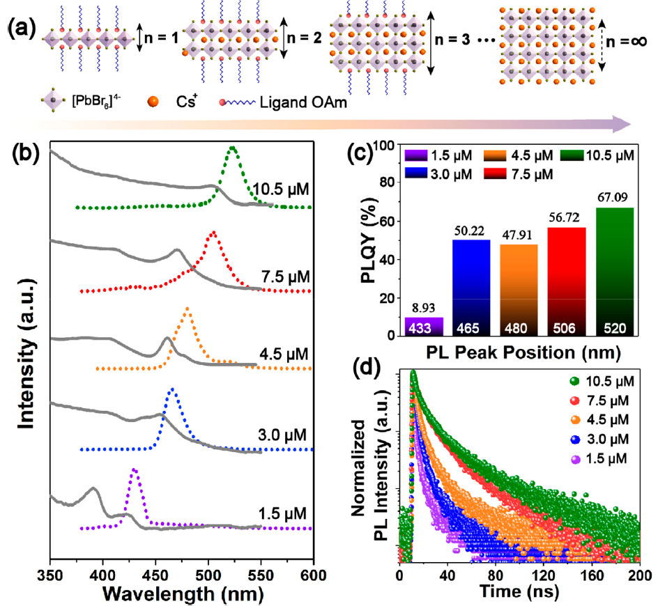 3 卤化物钙钛矿量子点典型形貌图(上)和稳态(中)、瞬态(下)荧光光谱。