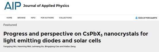 近期,曹丙强教授受美国物理学会Journal of Applied Physics期刊邀请,撰写一篇评述性综述论文(Perspective),全面回顾并总结了全无机卤化物钙钛矿纳米晶的最新研究进展,着重讨论了全无机卤化物钙钛矿纳米晶的结构稳定性、光电物理性能及在发光二极管(LEDs)与 太阳能电池(SCs)领域中的应用,为相关科研人员理解全无机钙钛矿的结构、光电性能及相关器件的未来发展方向提供帮助。这一成果以“Progress and Perspective on CsPbX3 Nanocrystals for Light Emitting Diodes and Solar Cells”为题,近期发表在 Journal of Applied Physics(J. Appl. Phys. 128, 050903, 2020),并被编辑推荐为特色文章(Featured Article,//aip.scitation.org/doi/10.1063/5.0014045)。