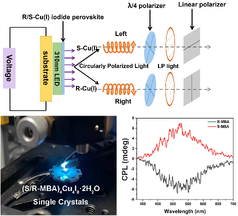 团队研究方向之二:手性单晶发光性能与器件研究。研究组生长了系列手性有机-无机复合晶体,并系统地研究了手性材料的圆偏振发光特性以及偏振光的选择性等性能,为偏振发光器件的进一步研究与应用提供了新的思路。