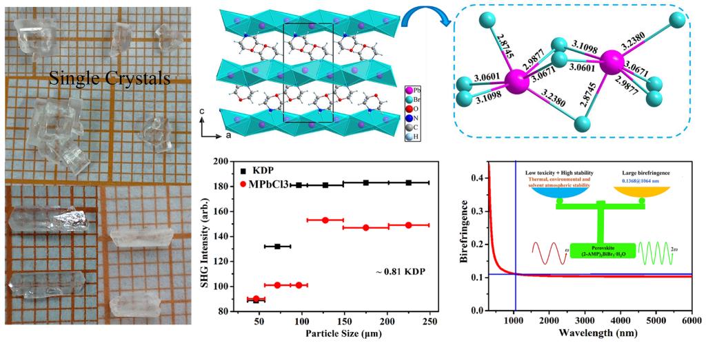 团队研究方向之一:无机及有机-无机复合单晶二阶非线性光学性能研究。研究组生长了系列有机-无机复合非线性光学晶体(钙钛矿结构和非钙钛矿结构)以及新型无机非线性光学晶体,并系统研究了它们的结构、热稳定性、非线性光学性能、激光损伤阈值等性能,并通过理论计算探究了晶体的非线性起源,为设计新型非线性光学材料奠定了坚实的基础。