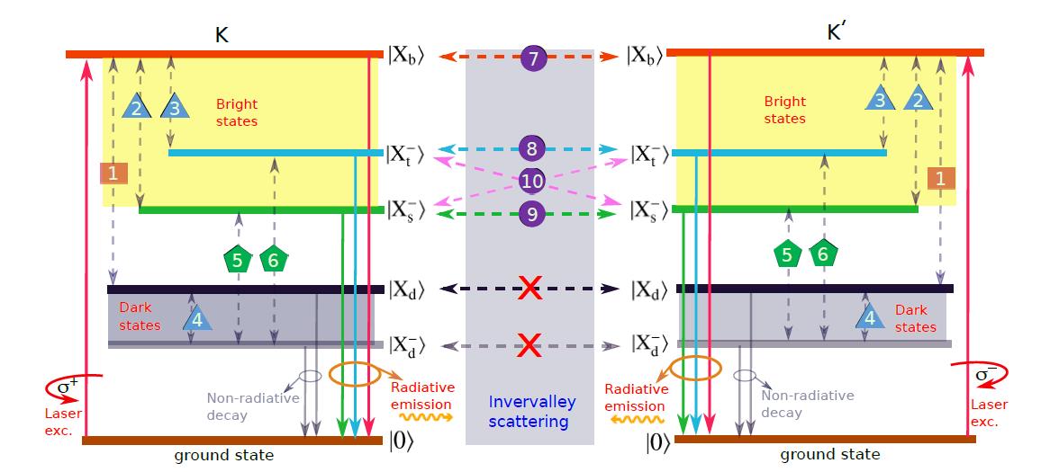 图:激子以及单态、三态带电激子(含亮态和暗态)谷内散射和谷间散射模型图。