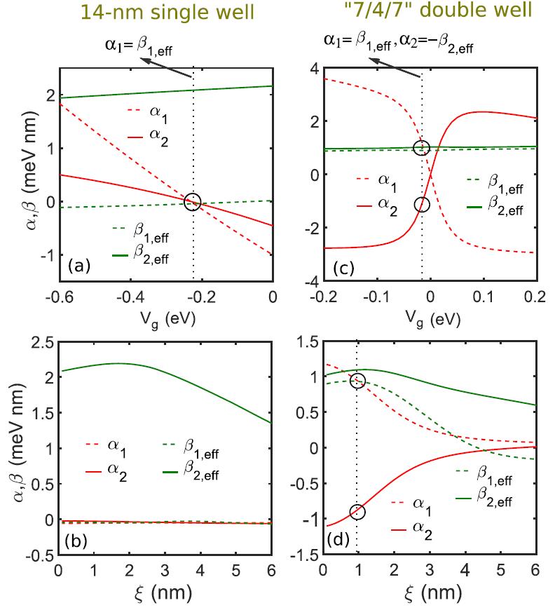 图:自旋轨道耦合偏压和界面平滑度调控(左列:单量子阱;右列:双量子阱)。