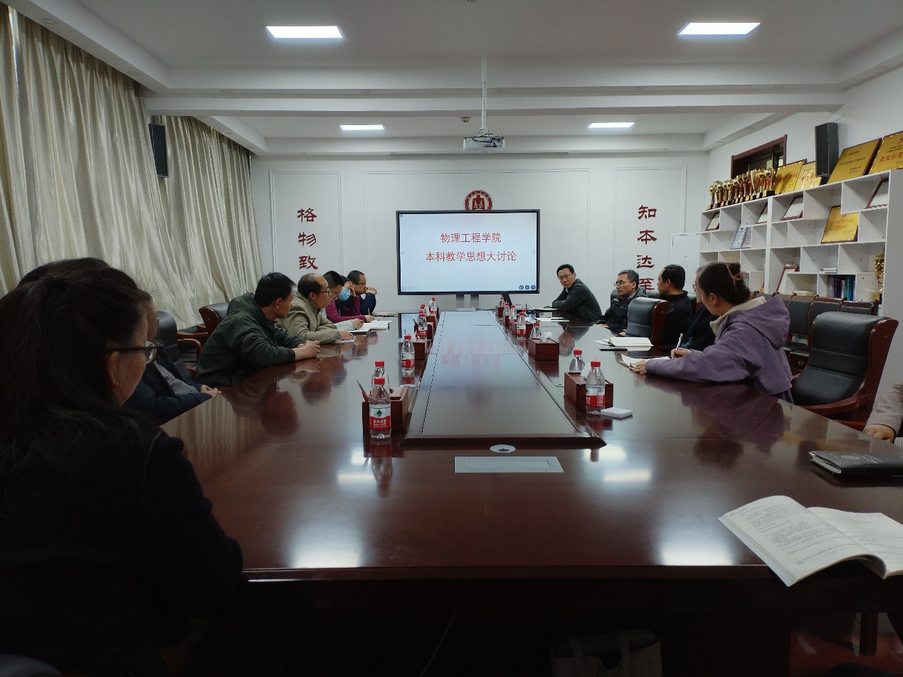 “本科教育教学思想大讨论”研讨会。会议由院长满忠晓主持,学院党委书记于健、物理系凝聚态物理教研室、理论物理教研室以及学科教学教研室教师参加了会议。会上,满忠晓详细梳理了学院在本科教育教学工作中存在的问题,以问题为导向精心组织讨论。参会教师讨论了本科教育教学中教师教学质量、教学方法与手段、学生学习态度和能力培养等方面存在的短板,并针对相关问题提出了相应的改进措施和解决方案,包括创新教学模式、优化课程设置、完善过程性评价制度等,以此来提高课堂教学效果,提升本科生培养质量。
