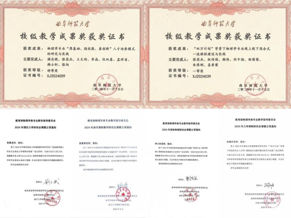 学院认真开展教学改革研究,积极申报各类教学改革项目。在此过程中,学院教学环境得到极大提升,学科特色更加凸显,育人功能不断增强。学院成功获批教育部物理学教学指导委员会教改项目4项,校级教改项目3项,校级课程思政示范课1门,校级教学成果奖特等奖1项,一等奖1项,二等奖3项。其中,1项教改项目推荐参加省级教改重点项目的评审,1项教改项目推荐参加省级L类选题“专项支持项目”的评审。